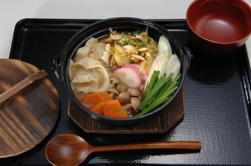 山梨県富士川町十谷地区の郷土料理「みみ(ほうとう)」は、小麦粉を練って1口大にしたものを野菜と共に味噌味で煮込んだものです。「みみ」は農機具の「箕」の形に似ていることからそう呼ばれていて、福をすくうと言われとても縁起の良い食べ物と言われています。